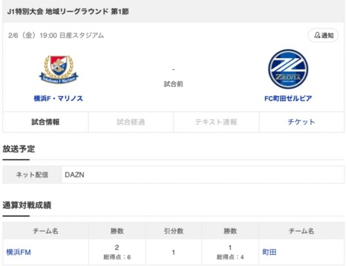 2月6日(金)19時から行われるのは、横浜Fマリノス対町田ゼルビア。
